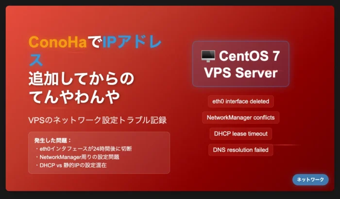 このサイトはConoHaのVPS上に構築しています。先日、興味本位でIPアドレスを追加し、「追加IPアドレスを使う|VPSならConoHa」にのっとって設定したところ、色々エラーが起きました。 なんとか落ち着いたと思うのですが、その顛末を。どうも、NetworkManagerは無効化しないほうがよさそうな感じです。 (2017/02/12)ConoHaのページを見ると... -
