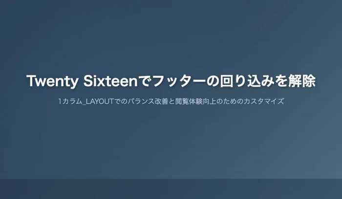 WordPressの標準テーマの一つであるTwenty Sixteenでは、表示領域が大きくなったとき…具体的には、985pxを超えたとき、singleページにおいて、記事本文の左側にフッターが回り込み、日付などのメタ情報を表示します。Twenty Sixteenの大きな特徴といえるデザインですが、これをなくします。 1カラムではバランスが悪い Twenty Sixteenの左側... -
