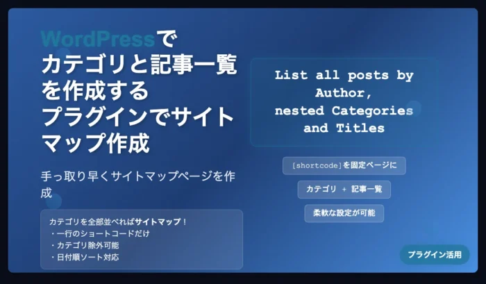 本記事は、WordPressのサイトマップページをプラグインを用いて作成する記事です。サイトマップと言うと、Googleさんの見回り用に提出するsitemap.xmlが思い浮かぶのですが、昨今のサイトを見ていると、全記事一覧を表示するhtmlのサイトマップページがよくあるようです。これは確かに便利で、サイト全体を俯瞰したいという気持ちのある自分... -