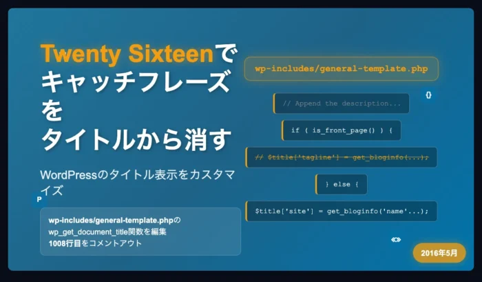 現在のWordPressでデフォルトとなっているTwenty Sixteenでは、フロントページのタイトルが「サイト名 - キャッチフレーズ」となっています。キャッチフレーズが長いと、titleが無駄に長くなり、不都合がある場合もあります。他テーマだと、header.phpやらfunction.phpやらをいじればよいことが多いようですが、Twenty Sixteenではwp-include... -