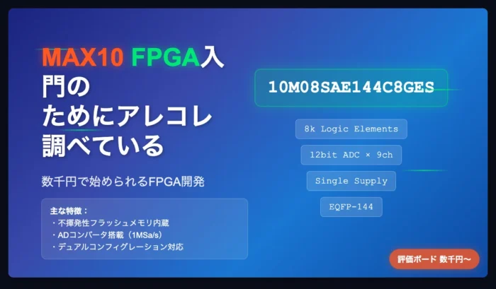 MAX10という、数千円という安価で評価ボードを入手できるFPGAを知り、現在入門中である。FPGA初心者として、MAX10についてまとめておきたい。 何故FPGAか FPGAはField Programmable Gate Arrayの略で、その名のとおりプログラマブルに、いうなればソフトウェア的にハードウェアの設計ができるようなもの、とざっくり理解している。 よく比較... -
