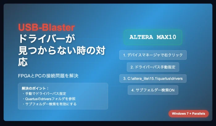 最近FPGAに手を出した。ALTERAのMAX10である。早速使おうとUSB-BlasterにてPCと基板を繋いだところ、USB-Blasterのドライバーをインストールしているのにも関わらず、うまく認識してくれない。手動でドライバーのパスを指定してやると、うまくいった。 状況 まず環境。 Windows 7 64bit on OSX 10.11(Parallels Desktop 10) ALTERA MAX10 USB... -
