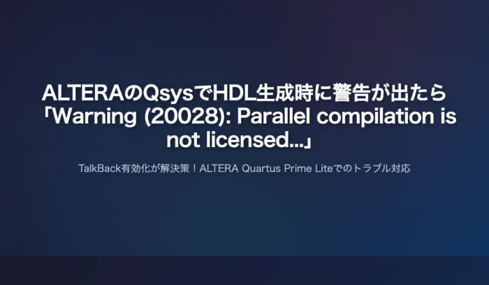 ALTERAのQuartus Prime Liteで、QSYSを使ってHDLコードを生成するとき、Warning (20028): Parallel compilation is not licensed and has been disabledという警告が出た。どうやら、TalkBackを有効化させないといけないらしい。 状況 まず、環境は以下。 Windows 7 64bit on OSX 10.11(Parallels Desktop 10) Quartus Prime Lite 15.1 Qsys... -