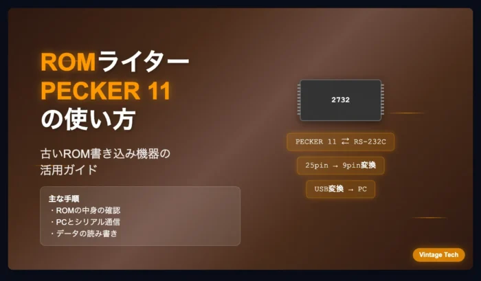 ROMライター PECKER 11 の使い方メモです。使用方法がわからず途方に暮れていましたが、このような古い機械にも関わらずネットで使用報告があり、たいへん助かりました。「AVALのROMライター PECKER-11で2732Aを焼いてみました - きょうのかんぱぱ」にあるとおりなのですが、自分なりに必要なところをまとめました。 やること やることは以下... -