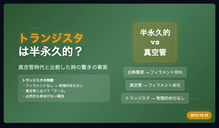 勉強のためトランジスタの簡単な本を読んでいたところ、次の一文が気になりました。曰く、「トランジスタは半永久的」え?と思いました。 私が見ている機器でもっともよく壊れる部品の一つがとトランジスタです。特に大電力のパワートランジスタがひどい。おまけに製造中止になっていて代替品を探して〜なんて苦労もあったりするわけですが、...