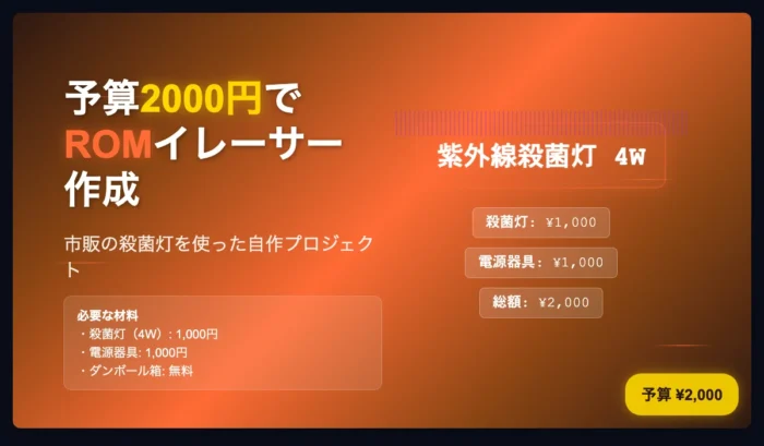 最近昔のROMを扱う必要があり、ちょこちょこといじっています。それでROMイレーサーが欲しくなったのですが、調べて見ると安いものでも15,000円程度はするようで、ちょっと手が出ません。が、要は紫外線をぶち当てたらよいということで、市販の殺菌灯を用いることでROMイレーサー代わりになるらしいのです。(参考:「ROMイレーサーを作って... -