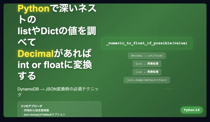 DynamoDB使ってるとちょくちょくあるシチュエーションかなと思う。DynamoDBはDecimalだけどjsonになおす時にDecimalあると使えないし。 こういうロジック考えると地味に頭使うと思うんだけど、ChatGPTが1秒で考えてくれました。なんか軽く死にたい。しかも結局使わなかった😂 環境 Python 3.9 ロジック 以下、int, floatは何もせず、Decimal... -