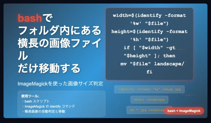 なんか限定的な用途ですが、表題まま。Stable Diffusionとかで絵をいっぱい作ってるとやりたいことがあるので。なおChatGPTに教えてもらった模様。 環境 bash imagemagick スクリプト カレントディレクトリにある横長画像をすべてlandscapeフォルダにぶちこむ。 #!/bin/bash # landscapeフォルダが存在しない場合は作成する if [ ! -d "lands... -