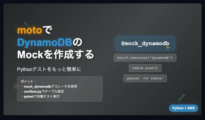 最初に作る時いつもどうやるんだっけ?となるのでメモ。 motoを使ってDynamoDBのmock作る時のテンプレ。 環境 Python 3.9.16 boto3==1.18.1 pytest==6.2.4 moto==4.0.5 macOS 12.6.3 ディレクトリ構造 func/app.py をテストする感じで。 . ├── func │ ├── app.py ├── tests │ ├── __init__.py │ └── unit │ ├── __init__.py │ ├── conftest.p...
