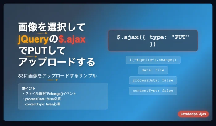 画像を選択して、jqueryの$.ajaxでPUTしてアップロードするごく簡単なサンプルのメモ。S3に画像をアップロードするときに使った。 やること ファイルを選択して読み込み、読み込んだ画像を指定のURLにアップロードしたい。 ここではjQueryを使う。 サンプル 上図のように、ファイルを選択して、右隣の雑なボタンをクリックするとファイルがア... -