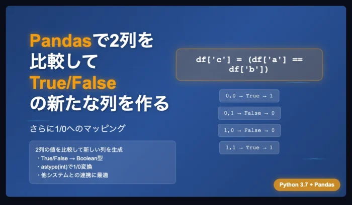 Pandasで2列を比較してTrue/Falseの新たな列を作る。さらに1/0へのマッピング