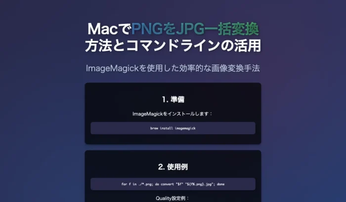 Macで、ターミナルよりカレントディレクトリにあるpngファイルを一括でjpgに変換します。逆も同じです。Macというよりbashですが。。。 準備 定番のImageMagickを使います。Homebrewでインストールするのが楽です。 Homebrew — macOS 用パッケージマネージャー brew install imagemagick 使用例 たとえば、.pngファイルを.jpgファイルに変換... -