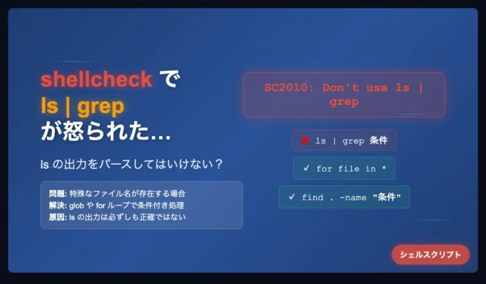 shellcheck で ls | grep が怒られた…ls の出力をパースしてはいけない?
