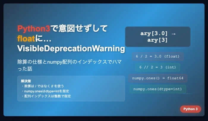 Pythonで、以前から「VisibleDeprecationWarning: using a non-integer number instead of an integer will result in an error in the future」という警告が出て、なんだろうなと思っていたのですが、どうやら意図せずして要素数がfloatに、つまりary[3]となるべきところがary[3.0]のような状況になっていました。python3では6/2=3.0なんで... -
