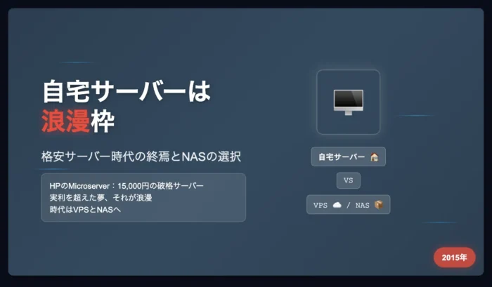 3,4年くらい前に、格安のサーバーが流行っていました。HPのMicroserverは、3.5インチのベイが4台分ある、コンパクトなサーバーマシンで、15,000円という今見ると破格の相場でした。他にも、探せば色々と格安のサーバーがひっかかったものですが、2015年現在、すっかり下火となってしまっているようです。Microserverの後継機は普通に数万円し... -
