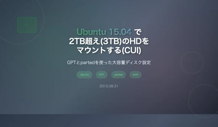 久しぶりにUbuntuを使うと、設定ファイルの書き方など変わっているところもあり、多少戸惑いました。本記事では、Ubuntu 15.04上で、CUI、すなわちコマンドラインにおいて、従来のMBRでは扱えない2TB以上のハードディスクをマウントする手順を書きます。他のディストリビューションでも同様ですが。 手順 ハードディスクを認識しているか確認... -