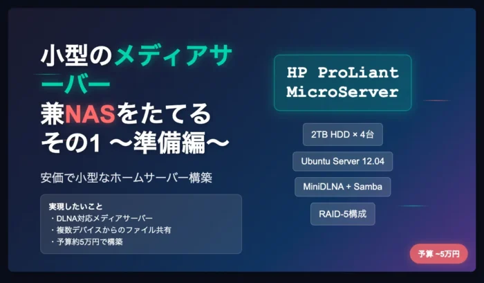 小型で安価に動画とかをいろんな端末で見られるメディアサーバーをたてたいなぁ、と思っていろいろした(してる)ときの記事です。最終的には、他のPCからサーバー内のファイルにアクセスして自由にやりとりしたり、DLNAクライアントからサーバー内の動画ファイルをストリーミングしたり、といったことをできるように実装します。選定したハー...