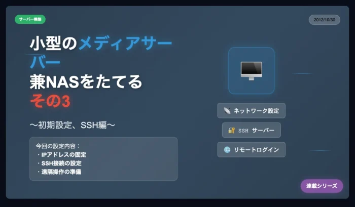 ネットワーク周りの設定 前回まででひとまずPCとして最低限のことはできるようになったわけですが、それだけではサーバーとは言えないので、今回からようやく各種機能を実現するソフトウェアの設定にとりかかります。といっても、今回は主にネットワーク絡みの設定をちょちょいとするだけです。具体的には、他のPCから遠隔操作するための設定... -