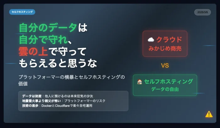 クラウドという言葉が定着してもう10年以上経過する。僕はバズワードに過ぎないと思っていたのだが、思いのほか概念として定着したようだ。クラウドとはとどのつまり「他社にデータを預けても良い仕組み」そして「それをクールだとする社会的な思い込み」の総称だ。 本来、データを預けるのは多くの人にとって受け入れがたい仕組みである。デ... -