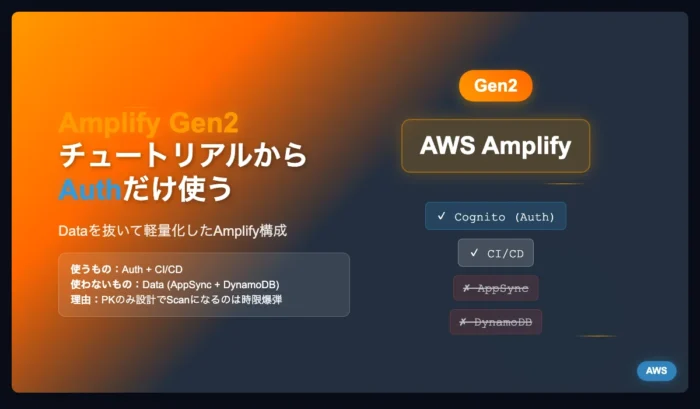 個人的にAmplifyは色々と重たすぎると思っていて、正直あまり使いたくなかったんだけれど、いつのまにかなんだか色々セットになってしまっていて、中途半端に導入するならAmplify Gen2で必要なところだけ使うほうがいいかなと思った。 前提として、「Quickstart - AWS Amplify Gen 2 Documentation」の内容を通して理解していること。Quickst... -