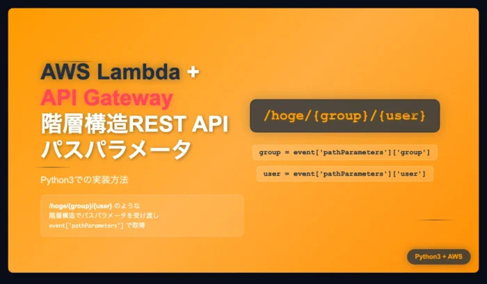 AWS系の記事を書くと、サービス名が入るのでどうしてもタイトルが長くなってしまうのがつらい。二時間ドラマでもここまで長くない。 AWS Lambda + API Gateway でREST APIを作るとして、/hoge/{group}/{user}のように、URI階層構造にして、かつ{group}と{user}をパスパラメータとして関数内で処理するようなパターンを考える。ちなみにLambda... -