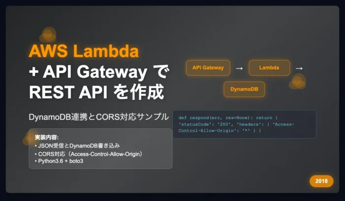やたらと長い表題になってしまったがこのとおり。AWS Lambda + API Gateway でREST APIを作成する。API経由で値をjsonで渡してDynamoDBに書き込み、さらに返り値をjsonで得られるようなサンプルを作成する。Lambdaはpython3.6で書く。 すっごいハマった……。 やること REST APIを叩いて、DynamoDBに書き込みを行いたい。かつ、返り値を得て結... -