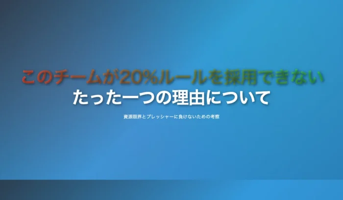 Googleで有名な20%ルールは、エンジニアにとって垂涎の羨ましい制度だ(一時期なくなったという噂を聞いたが、今はどうなっているんだろう?)。憧れるよね。いいよね。わかる。僕もできることなら取り入れたいと思う。 でもダメです。ごめん。このチームではできません。しないんじゃなくて、できないです。多分、言えばわかってもらえると... -