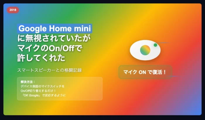 Google Home miniが私の声に応えてくれない。本体に触れると、なにやらLEDが光って反応してくれて、その後に「OK Google」というと一度は反応してくれる。だが、その後はまたうんともすんとも言わない。悲しい。再起動したり電源落としたりデバイスのリンクを解除したりしたけれど、やっぱりうまくいかない。 ……あれこれした挙げ句、どういう... -