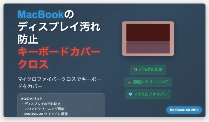別にキーボード専用のクロスというわけではないと思うのですが、液晶ディスプレイの清掃に使うような、マイクロファイバを謳う大判のクロス(クリーニングクロスと言うのでしょうか?)をキーボードカバークロスとして使っています。MacBook Air 11インチを使っていますが、キーボードの汚れがディスプレイに付着するのがずっと気になってい... -