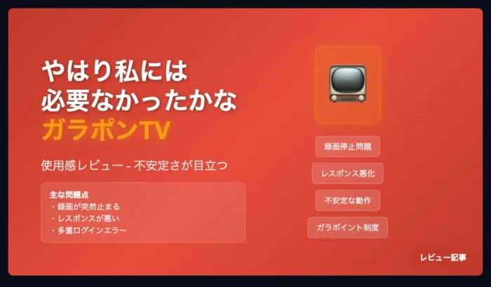 どうにも使いづらい コンセプトは良いと思いますし、最初は物珍しさもあって使っていたガラポンTVですが、最近は置物化しつつあります。気が付くと録画が止まっているということがちょくちょくありますし(再起動後の録画の復帰もやたら時間がかかる…)、唐突に落ちてしばらくアクセスできなくなったり(しかも復帰までが長い)、再生中の番... -