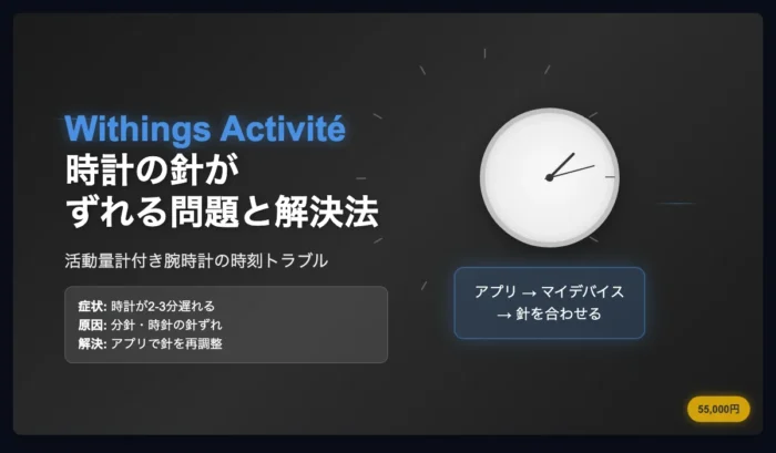 私はWithingsの活動量計機能付腕時計、Activitéを使っています。ここしばらく、時計がずっと2,3分遅れていました。電池切れがあるとそういう症状になるので、もうバッテリー切れか?と電池を交換するも改善せず。調べてみると、分針がずれていました。そして数日後、今度は時針がずれていました。 症状:時計が一定時間遅れる(ずれる) 時計... -