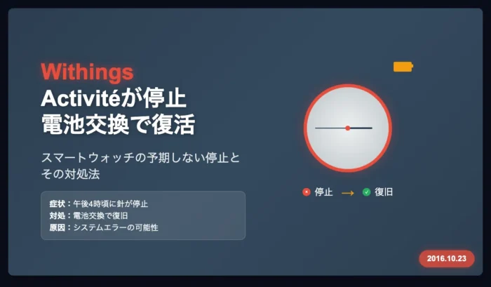 Withingsのスマートウォッチ、Activitéを愛用していますが、午後4時くらいから時計の針が止まりました。アプリもデバイスを見つけられない。試しに電池を取り替えてみると、再び動き出しました。電池切れではないと思います。恐らく内部的なトラブル。ここ一ヶ月でトラブルがちょいちょい起こっています。うーん。 症状 特に時刻のずれなどが... -