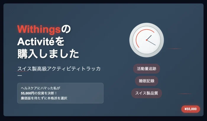 最近ヘルスケアにハマっています。ずっと気になっていて、本ブログでも何度か話題にしているWithingsの腕時計型アクティビティトラッカーActivitéですが、先週ついに買ってしまいました。 購入 Amazonで55,000円ちょっとですから、決して安い買い物ではありません(値段だけで言えば、ヨドバシカメラの61,000+10%ポイントバックのほうが安い... -