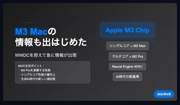 出るぞ出るぞというだけでちっとも音沙汰なかったMacのM3の情報だが、WWDCを控えて、急に情報が出てきた。 次期MacBook Air搭載の「M3」チップ、M2 Proを凌駕する性能か | Gadget Gate M3のベンチマーク予測〜シングルコアがM2 Max、マルチコアがM2 Pro超えか - iPhone Mania これによると、なんだか次のMBAはMBPよりも性能の高いものになる... -