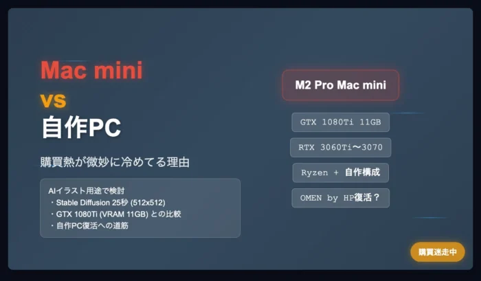 あれだけ色々と書いておきながら、結局M2 Mac miniはポチらないまま来週を迎える気になっている。理由は色々とあるのだが、今は転換期のように思えたので、差し迫って必要でない今慌ててポチらなくてもいいかと思った。 まぁ予算25万という現実の前に「それだったらグラボほしいわ」とか思い始めたのも大いにある。AIやるならなんだかんだでN... -