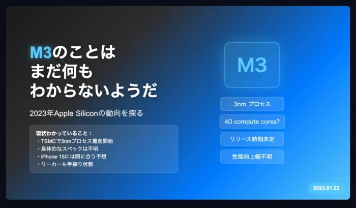 2023年が始まってわかったことは、2022年の間に流れていたApple Silicon周りの噂はてんで的外れだったということだ。そんなわけだから、今流れている2023年Macの噂もあんまりあてにすべきではないのだろう。ないのだろうが、噂から判断するしかない。 TSMCで量産開始の事実しかない 噂といっても、去年から誰もMacの動向を予想できていなかっ... -