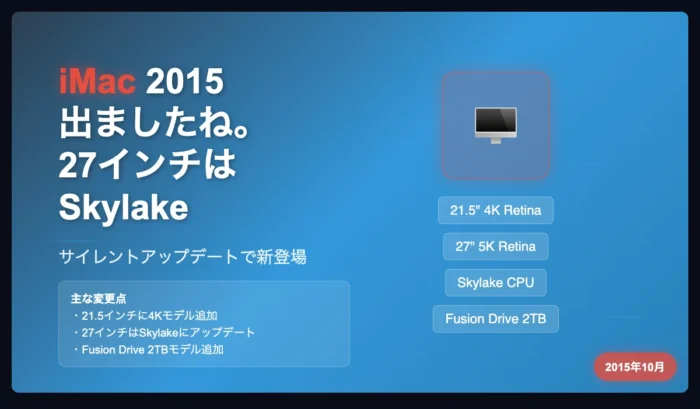 10月中に新作が発表されるのではと噂されていたiMacですが、何の前触れもなくサイレントにアップグレードされました。21.5インチに4Kモデルが出たのと、27インチモデルがまぁ順当にアップデートされた、くらいのものです。CPUがBroadwellなのは残念な気もします。27インチのほうはちゃんとSkylakeのようですけれど。 割と順当なアップデート ...