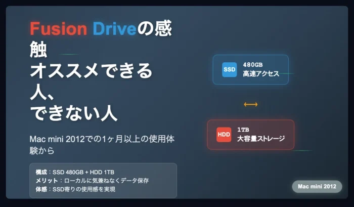メインデスクトップマシンのMac mini 2012をFusion Driveにしてから一ヶ月以上経ちました。実際の使用感から、どういう人にオススメできるか、考察します。 2016年10月追記:使い始めて1年ほどたちますが、調子よく使えています。 2018年3月25日:まだ調子よく使えてます。最近SSD容量は大事かもと思いました「Fusion Driveと純SSDの分かれ目... -