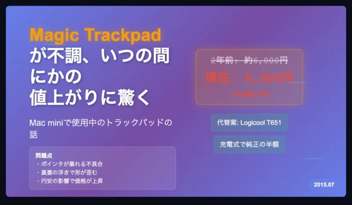 MagicTrackpadの調子が悪くなって久しいです。ポインタがびょんびょんとアクロバティックに飛び回る現象が、常にではないものの時折くらいの頻度で起きます。買い替えなきゃいけないかなぁと思ったら、調べてびっくり1万円。たしか私が購入したときは6,000円足らずだったと思うのですが、円安の影響はここにもきていました。 失敗したかなと... -