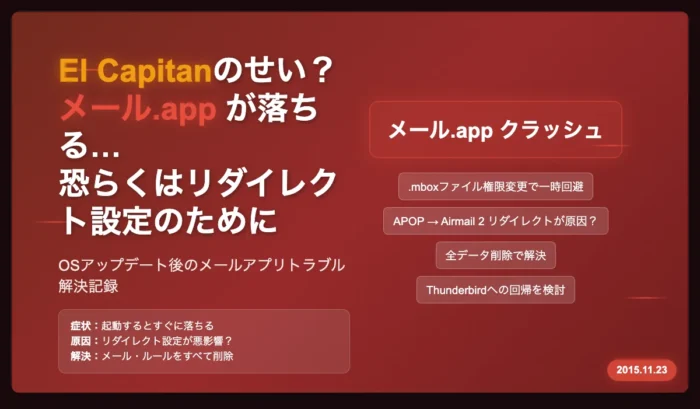 El Capitanのせい?メール.app が落ちる…恐らくはリダイレクト設定のために