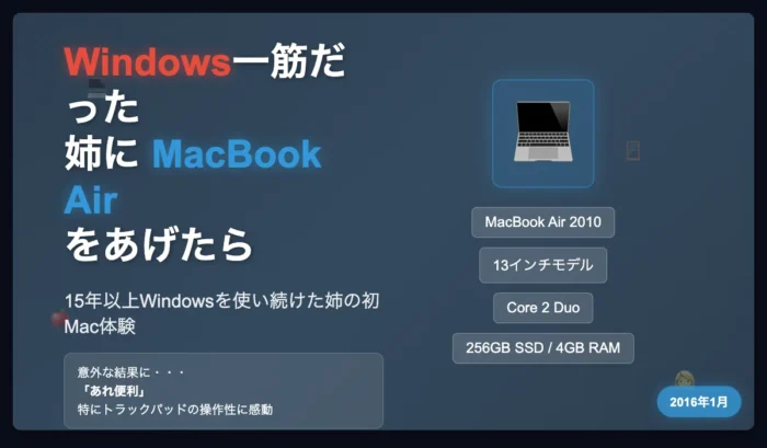 MacBook Air 2010 13インチをWindows一筋だった次姉にあげました。あまり気に入らないのではないかと思っていたのですが、存外気に入ったようです。特にトラックパッドの操作性が良かったらしい。 Windows一筋 私には二人の姉がいて、次姉は昔からパソコン関係が好きな人です。我が家にパソコンが入り込んできたのは、ご多分に漏れずWindows ... -