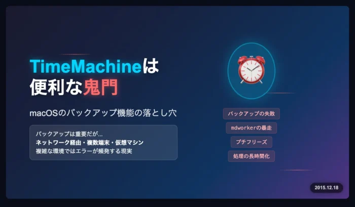 ここしばらく、TimeMachineにずっと悩まされています。バックアップの作成が失敗する、やけに時間がかかる、mdworkerが暴走する、プチフリーズが起きる、といった症状が発生します。TimeMachineを削除して、すべて止めてしまうと、こういった症状のすべてがなくなりますので、TimeMachineが起因となっていることは間違いありません。 バック... -