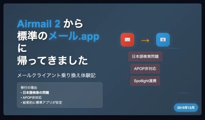 Airmail 2はOSX用のメールクライアントで、安くはありませんが、熟れたUIで使いやすく、個人的には気に入っていました。しかし個人的な問題が二点あります。一つはAPOPに対応していないこと(職場でどうしても必要で…脆弱性が見つかってもう何年もたつのになぁ「IPA 独立行政法人 情報処理推進機構:脆弱性関連情報取扱い:APOP方式における... -