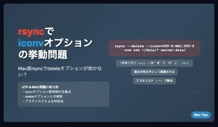 rsyncでiconvオプションをつけると、deleteオプションの挙動が変わる??(Mac)