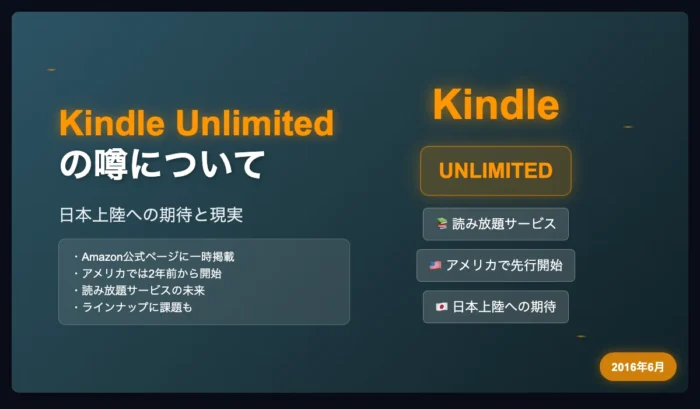 Kindle Unlimited日本上陸の噂 先日、ついに日本にもKindle Unlimitedが上陸するかという噂が流れました。発端は「【続報】時期尚早だったからか公式の Kindle Unlimited 関連ページが削除されてました (2016.6.20) : Kindleセール情報ブログ「キセブ」」という記事でして(よく調べてるものですね…)、Internetwatchやらが取り上げたので、... -