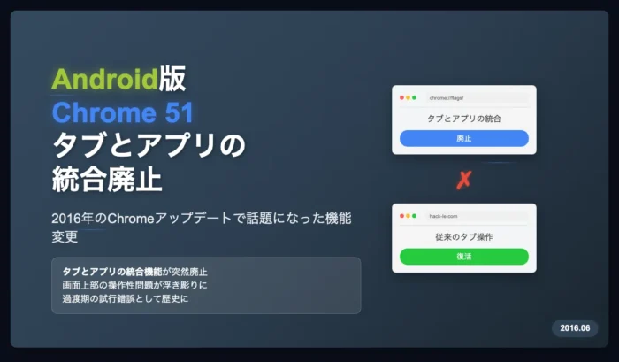 いつぞやから、Android版Chromeでタブとアプリの統合なる機能が実装されました。Chromeのタブの一つ一つをアプリとして扱うよ、的なものです。Google様の言うことだからとなるべく使うようにしていたのに、いつの間にか廃止となりました。 いつの間にか実装されていつの間にか廃止 この機能がデフォルトでONになったのか、それともアップデー... -
