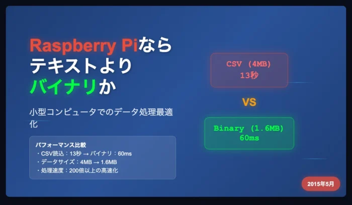 テキストファイルは便利です。なにしろわかりやすい。単純明快。csv形式は最高のフォーマットの一つだと思います。あらゆるデータはできるだけcsvで残しておきたいものです。 人にわかりやすいテキスト、コンピュータにわかりやすいバイナリ しかし人間にとってわかりやすいものはコンピュータにとってはわかりづらい。逆も又然り。コンピュ...