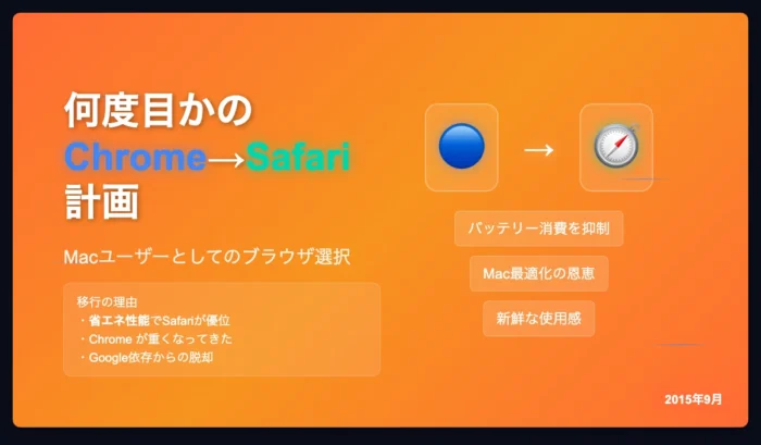 Google Chromeを使い始めたのはもう何年前のことか思い出せません。FirefoxからChromeに乗り換えてからずっと愛用しています。大きな不満があるわけではなく、強いてあげればバージョン45よりUnity WebPlayerが非対応となり、一部のブラウザゲームがプレイできなくなったくらいなのですが、Chrome→Safari移行を計画中です。もう何度目かな。...