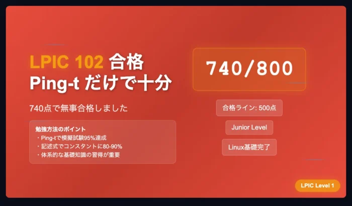 本日、LPIC102を受験し、無事合格しました。スコアは740で、最大800、500以上が合格であることを考えると、十分な結果だと思います。勉強代から受験代まで、すべて自費ですから、とにかく絶対に落ちたくない一心で、余裕を持って受験しました。Junior Levelだそうですが、兎にも角にも、これでなんとか私もLinux子供レベルは名乗ってよいとい... -