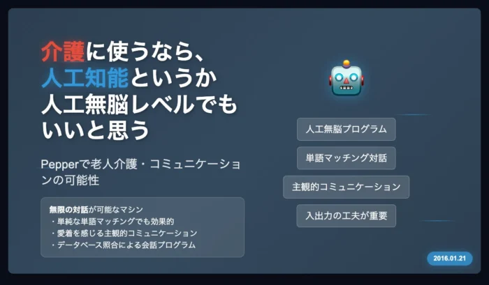 介護に使うなら、人工知能というか人工無脳レベルでもいいと思う